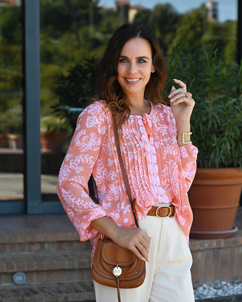 Oggi ho scelto di indossare qualcosa di diverso dal solito: una camicia in seta dai toni arancio-rosa. L’arancione non è una delle mie tinte abituali, ma ho scoperto quanto possa dare energia e vitalità al look. Ho abbinato la camicia a pantaloni bianchi dal taglio morbido, per un effetto elegante ma rilassato, e sandali bassi per un tocco di comodità e leggerezza. Questo outfit mi ricorda che a volte le combinazioni più interessanti nascono quando ci concediamo di uscire dalla nostra zona di comfort cromatica. L’arancione non è solo un colore estivo: è un piccolo carburante di allegria che possiamo portare con noi ogni giorno.