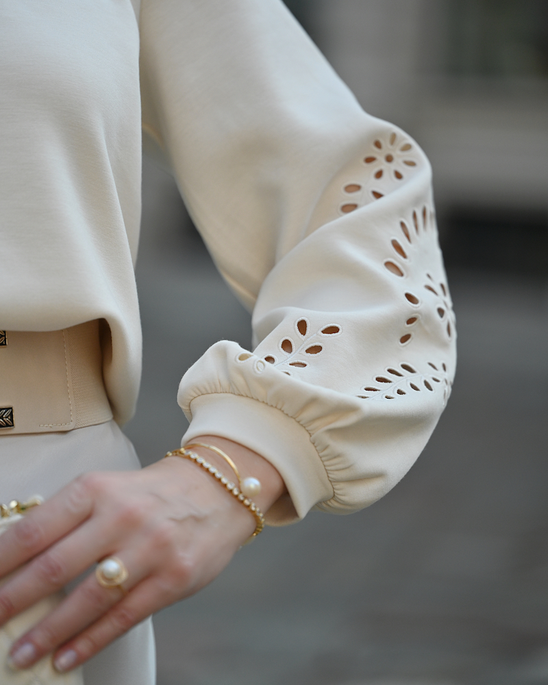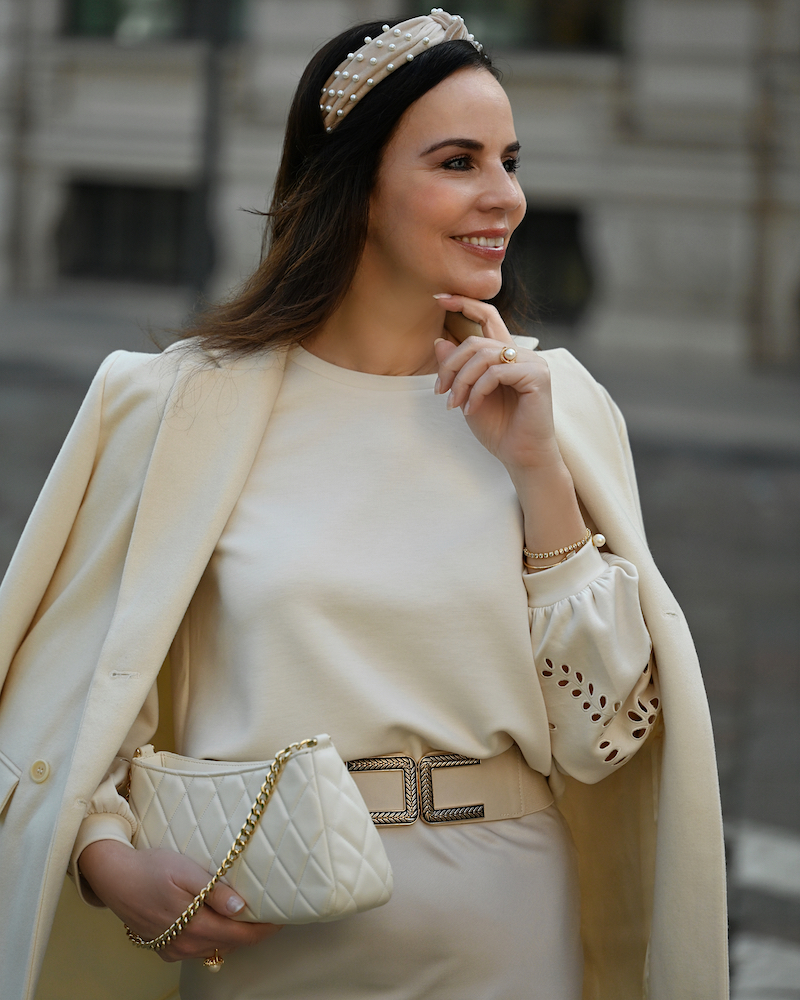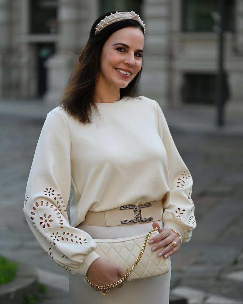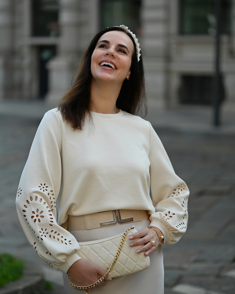 A volte sono proprio le piccole cose a fare la differenza più grande. Oggi il mio styling si basa sulla semplicità, sulla delicatezza e su una sensazione di comfort assoluto – tutto in una splendida tonalità crema, sempre elegante e morbida. Indosso una delle mie gonne preferita con bordo in pizzo, che dona al look un tocco romantico e leggero. Il pizzo aggiunge sempre quel “qualcosa in più”, senza mai risultare eccessivo. La abbino a una maglia sportiva con maniche intagliate, che rende l’insieme più moderno e rilassato, equilibrando perfettamente femminilità e praticità. Sono quei capi che amo definire “lusso quotidiano” – semplici, portabili, ma allo stesso tempo speciali. Vestiti che indossi al mattino senza pensarci troppo, ma che ti fanno sentire comunque curata e sicura di te. Tutto resta nei toni delicati del crema, creando un effetto armonioso, pulito e profondamente femminile. Ed è proprio nei dettagli che si nasconde la bellezza della quotidianità – nelle texture, nei tagli e nella sensazione che i vestiti lasciano sulla pelle.