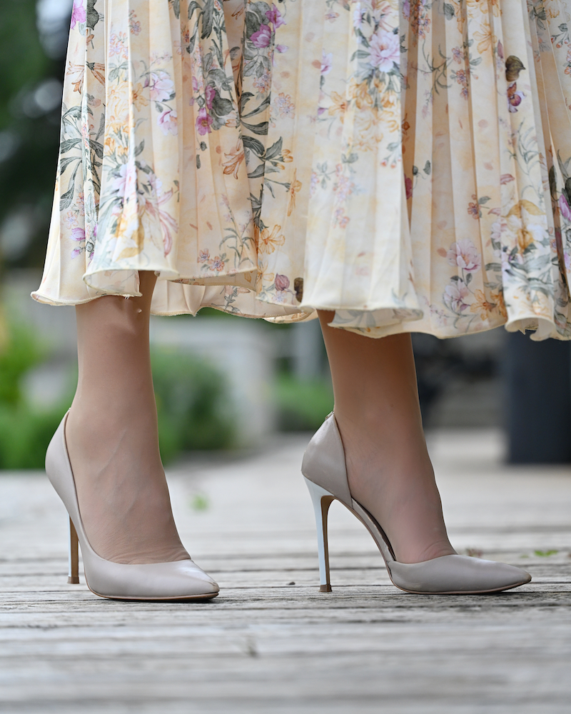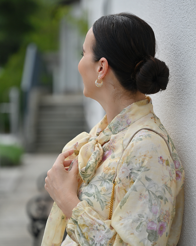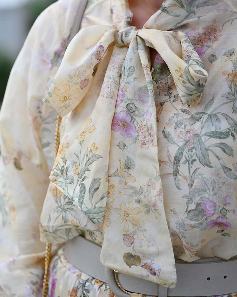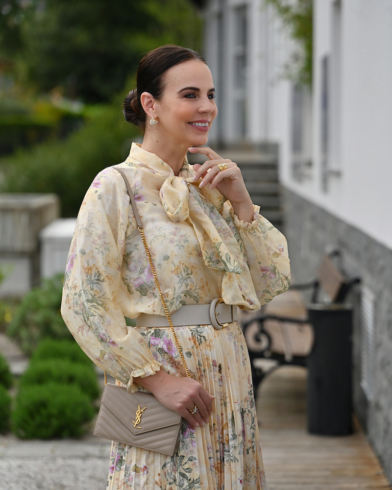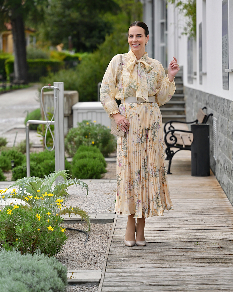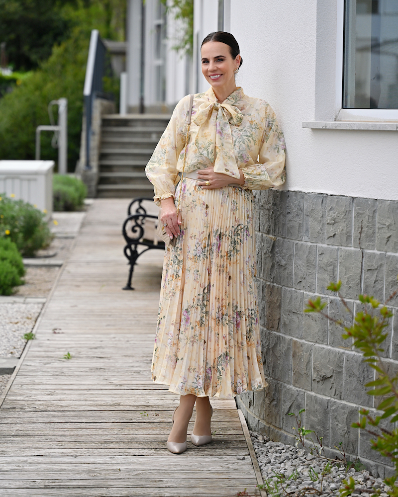 Ci sono giornate in cui basta un colore per dare un senso a tutto. Oggi è una di quelle, avvolta completamente nel giallo sole: una gonna plissé e una blusa con fiocco morbido, entrambe in una stampa floreale luminosa, che si muove con leggerezza naturale. La silhouette è fluida, femminile, quasi giocosa. Nulla è rigido, tutto respira. Il tessuto segue il corpo senza forzarlo, come se portasse con sé un po’ di aria e di luce. Dal punto di vista psicologico, il giallo è un colore di attivazione: stimola energia, ottimismo e chiarezza mentale, ed è spesso associato a una sensazione di apertura e leggerezza emotiva. È il colore che accende qualcosa dentro, in modo delicato ma immediato.