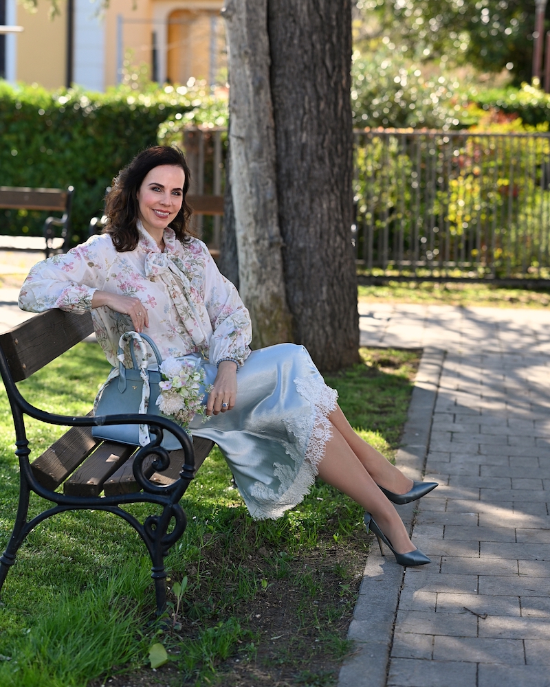La blusa con il fiocco è uno di quei capi senza tempo che racchiudono un’eleganza delicata e un messaggio profondo di femminilità. Quando la indosso, è come entrare in una dimensione romantica, dove sono i dettagli a raccontare la storia. Il fiocco al collo non è solo un elemento decorativo, ma un simbolo di grazia e forza sottile – una femminilità sicura, mai ostentata. La stampa floreale amplifica questa sensazione di dolcezza. È come portare con sé un piccolo giardino, fatto di leggerezza e poesia, capace di evocare una primavera eterna. Ha qualcosa di nostalgico, ma allo stesso tempo incredibilmente attuale – perfetto per una donna che ama la bellezza in tutte le sue forme. A completare il look, una gonna midi in raso, fluida e luminosa, che accompagna ogni movimento con eleganza. Il bordo in pizzo aggiunge quel tocco finale, discreto ma seducente, raffinato e mai eccessivo.