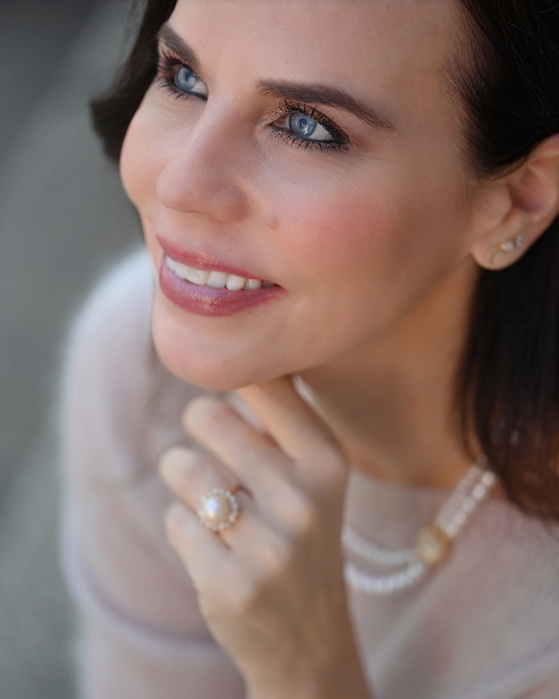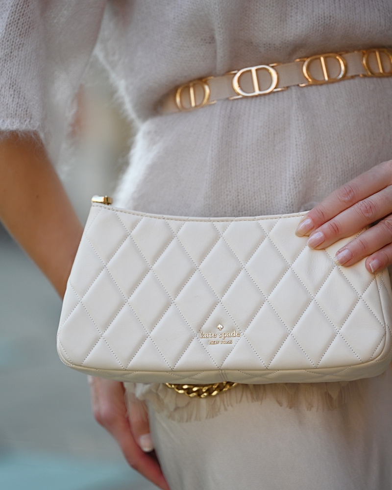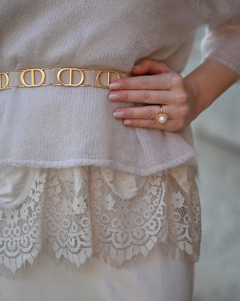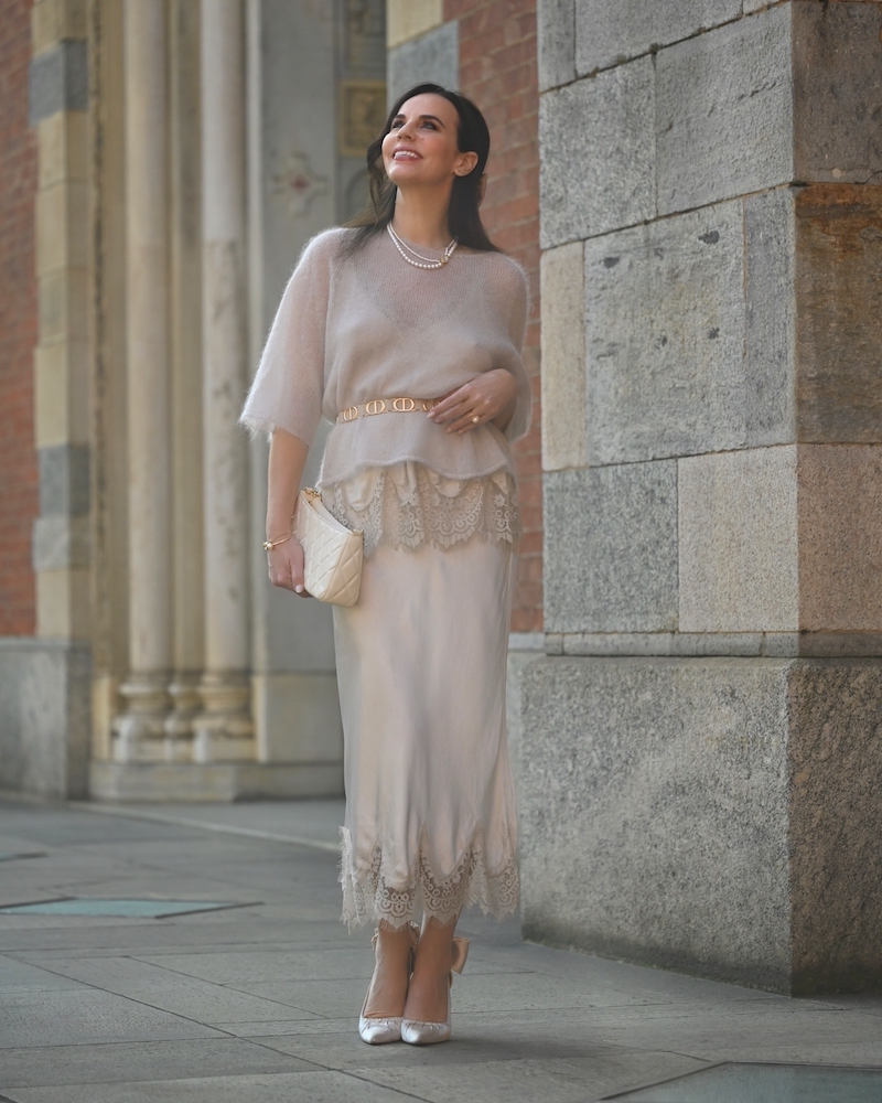 A volte indossi qualcosa e pensi: cavolo, ma questa sono proprio io. Al 100%. L’abito smette di essere solo un capo e diventa parte di te, un’estensione della tua personalità, qualcosa che racconta una storia e inizia quasi a vivere una vita propria. È esattamente ciò che è successo con il completo che indosso: del pizzo e del satin sono da sempre innamorata e, quando incontro colori leggermente sbiaditi, il mio animo romantico si accende immediatamente. È un vero inno alla femminilità, reso ancora più caldo e avvolgente dalla maglia tono su tono. Tacchi alti e fiocchi completano un look che ho scelto per la settimana della moda e che ho amato profondamente, perché a volte la moda non è solo ciò che indossi — è ciò che senti.