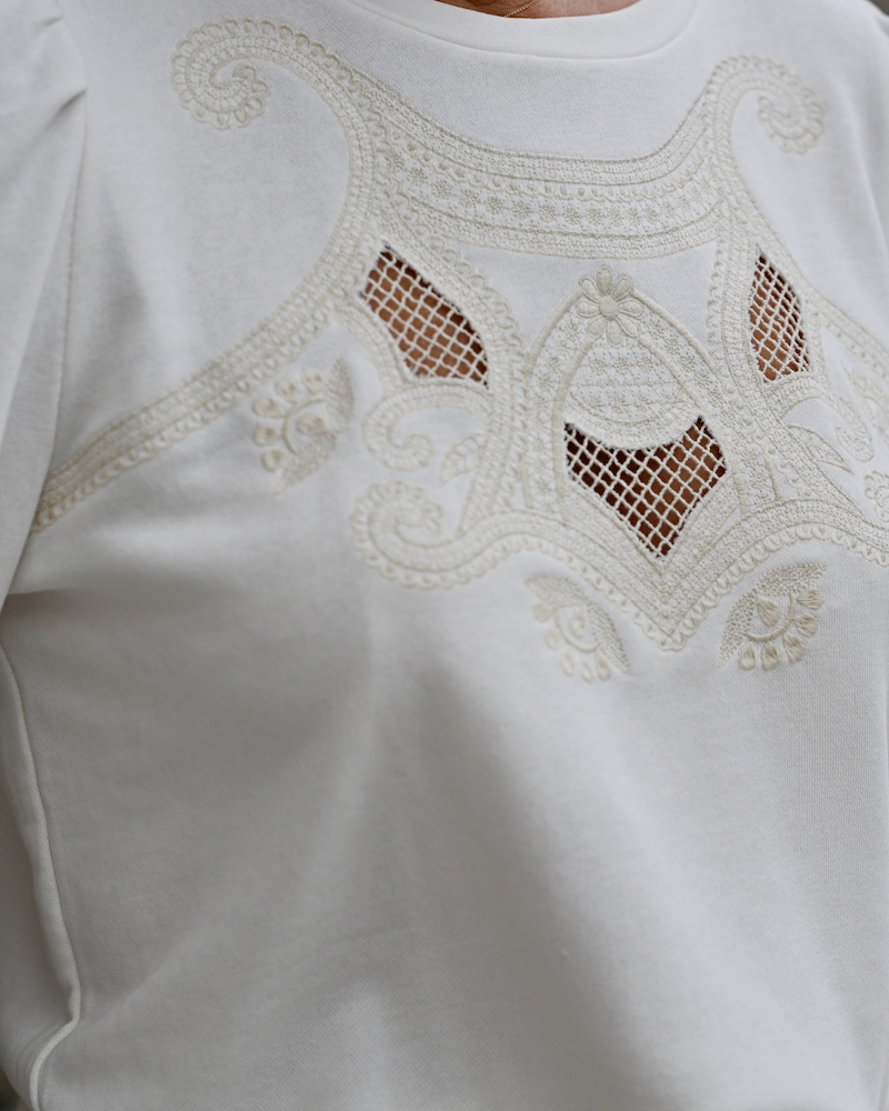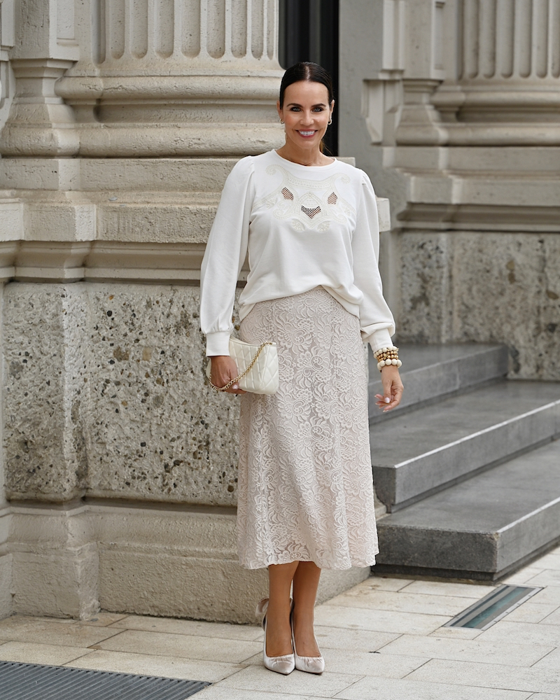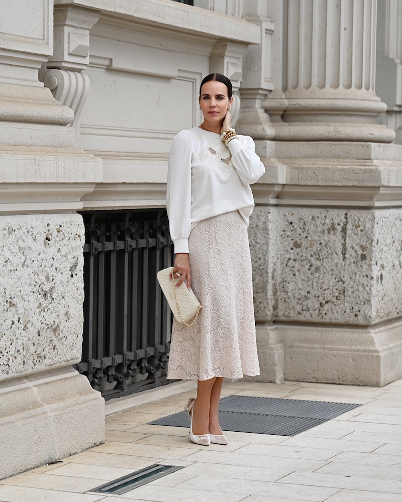 La moda vive di contrasti — sono loro a dare carattere, equilibrio e personalità a ogni look. Questa volta ho voluto giocare con due mondi diversi: la delicatezza del pizzo e la semplicità del cotone. Indosso una gonna di pizzo, raffinata e romantica, abbinata a un maglioncino di cotone dal taglio pulito, morbido e rilassato. Insieme creano quell’armonia inattesa tra eleganza e comfort, che amo sempre di più. Ai piedi, tacchi alti, perché bastano per cambiare l’attitudine di tutto il look, rendendolo immediatamente più sofisticato. Tutto nelle sfumature dell’avorio, un colore che parla di equilibrio, luce e purezza — e che sento profondamente mio. Perché, in fondo, la moda è questo: un gioco sottile tra opposti che, quando si incontrano, raccontano chi sei davvero.
