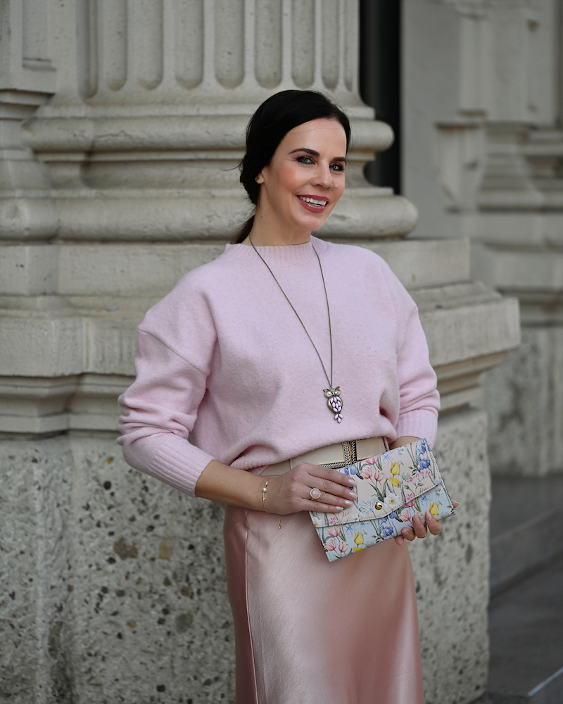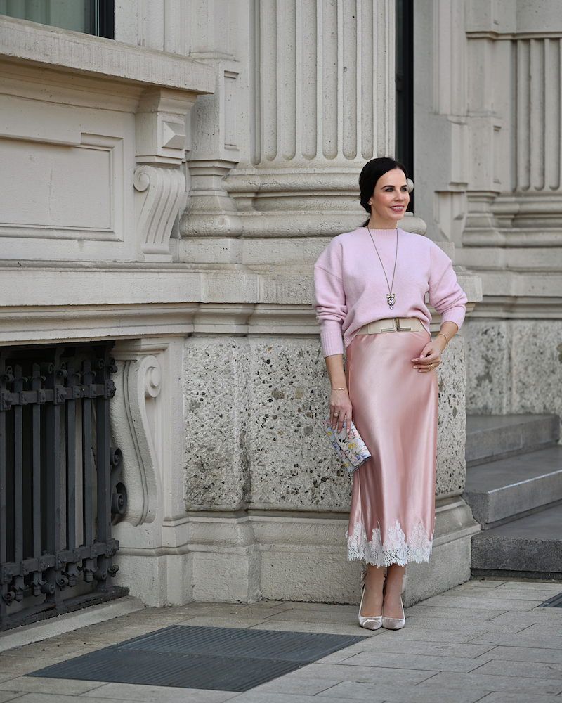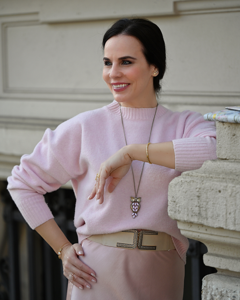 La primavera ha un’energia speciale: luce, delicatezza e la sensazione che tutto possa ricominciare. Non sorprende quindi che i colori pastello siano da sempre i suoi migliori alleati nella moda. Tra tutti, il rosa ha un fascino particolare: è femminile, luminoso e incredibilmente elegante. Oggi indosso un total look rosa. Un morbido maglione di lana avvolgente incontra una gonna in raso, impreziosita da un delicato bordo di pizzo. Il contrasto tra le texture – il calore della lana e la lucentezza del raso – crea un equilibrio raffinato e molto femminile. Vestirsi di rosa dalla testa ai piedi non è solo una scelta romantica, ma anche una vera dichiarazione di stile. È un colore che illumina il viso, solleva l’umore e porta nel guardaroba quella leggerezza che la primavera sa regalare.